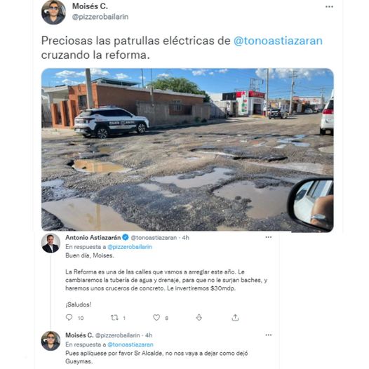 Las reacciones a esta publicación no se hicieron esperar, donde incluso el propio alcalde de Hermosillo, Antonio Astiazarán, puso su comentario: “Buen día, Moises. La Reforma es una de las calles que vamos a arreglar este año. Le cambiaremos la tubería de agua y drenaje, para que no le surjan baches, y haremos unos cruceros de concreto. Le invertiremos $30mdp. ¡Saludos!”, se lee el twitt del munícipe.