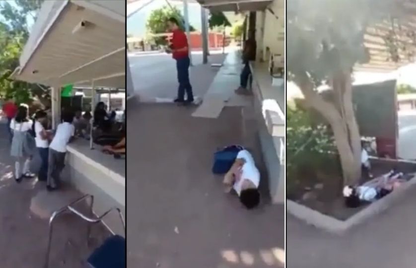 En el video se ve y oye a un supuesto profesor, quien viste una camisa roja, ordenas a los niños echarse al suelo. “¡Pecho abajo! ¡Protéjanse!”, ordena mientras los niños corren y se acuestan en el suelo o en jardineras.