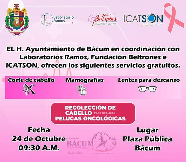 El Ayuntamiento de Bácum en coordinación con Fundación Beltrones y el apoyo de Laboratorio Ramos e ICATSON, ofreceran servicios gratuitos el próximo lunes 24 de octubre a partir de las 9:30 en la plaza pública de Bácum.