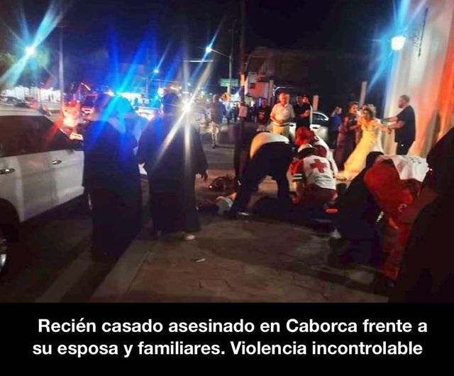 Este sábado, presenciamos los esfuerzos para mantener con vida a un hombre baleado, tendido en el piso frente a la Iglesia de la Candelaria en Caborca, en donde minutos antes había contraído nupcias, mientras que la joven esposa apenas era contenida, con su atuendo de boda manchado de sangre.
