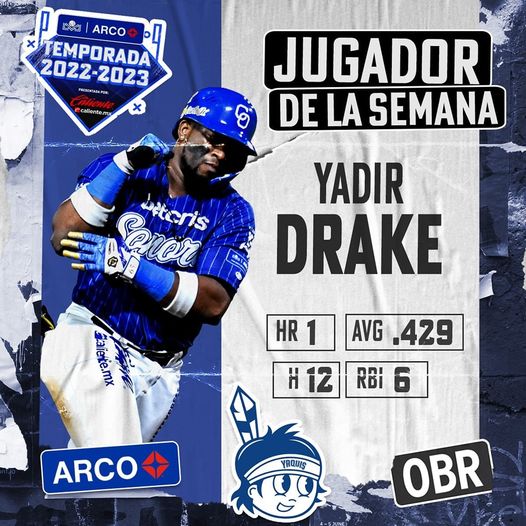 El cubano Yadir Drake fue nombrado Jugador de la Semana de la Liga Arco Mexicana del Pacífico luego de tener un brillante desempeño en la semana 3 a la ofensiva con los Yaquis de Obregón, donde fue fundamental para conseguir la primera serie como local.