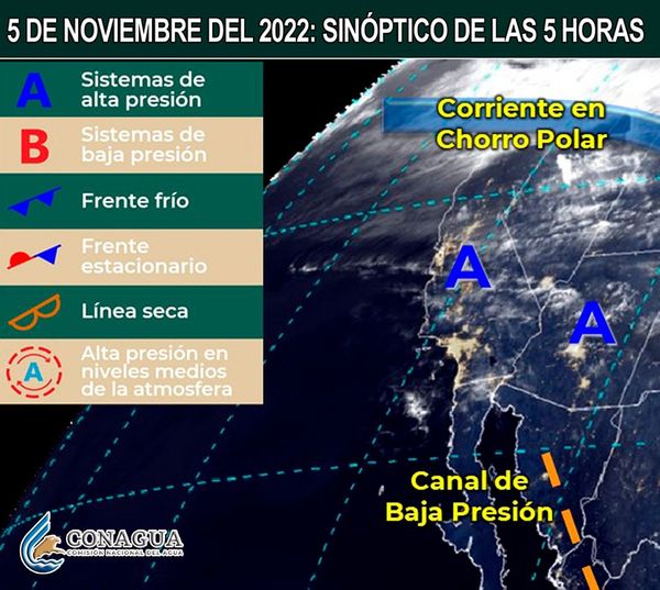 Hermosillo.- Para este sábado, por efectos de un canal de baja presión, en Sonora, se esperan condiciones de cielo medio nublado a despejado, sin probabilidad de lluvias, con vientos de 10 a 25 km/h y rachas de 30 a 40 km/h, así como, ambiente matutino fresco a frío en el norte y sierras, con valores de 3 centígrados bajo cero y ambiente templado a caluroso durante el día de 32°C, principalmente en las regiones noroeste, centro y sur.