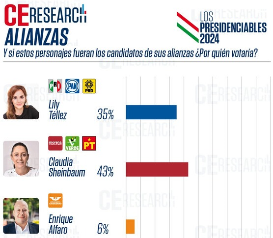 En la encuesta del 24 de octubre de la empresa CE Research S.A. de C.V., en el careo correspondiente a Lilly como abanderada de la alianza PRI-PAN-PRD y Claudia con Morena-PVEM y PT (aparece Enrique Alfaro con 6 puntos por un MC solo), la sonorense se encuentra en segundo lugar con 35 puntos mientras que Claudia tiene 43%. https://bit.ly/3DELo1P