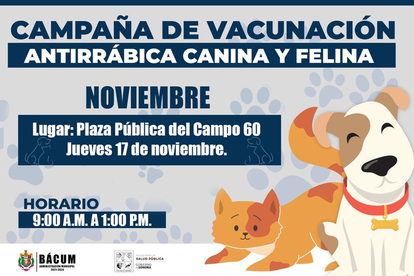 El día jueves 17 de noviembre se estará aplicando la vacuna antirrábica para perros y gatos en la Plaza Pública del Campo 60