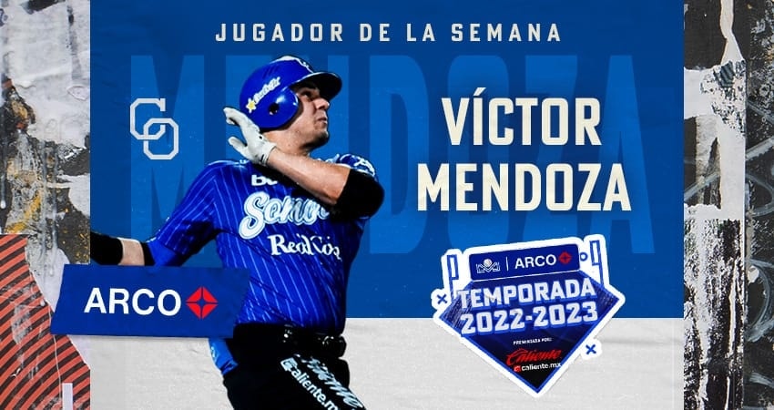 Guadalajara, Jalisco.- Los Yaquis cerraron la Primera Vuelta de la Temporada 2022-2023 presentada por Caliente.mx con 7 victorias de manera consecutiva, lo que los llevó a ser terceros en el standing y sumar 8.0 puntos de cara a la segunda mitad. La Tribu no lo pudo haber logrado sin el bate de Víctor Mendoza quien tuvo una semana excepcional ganando el nombramiento a Jugador de la Semana presentado por ARCO.