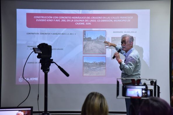 Durante el Diálogo con Cajeme, el Secretario de Desarrollo Urbano, Leonel Acosta Enríquez, informó sobre el avance de las obras en ejecución como la Ejército Nacional entre calle 10 y Paseo Miravalle con un avance del 42 por ciento, Kino y 200 con un 45 por ciento de avance, con un 62 por ciento de avance la calle Vicente Guerrero en El Portón, la obra en la Valle Pascola con un 85 por ciento de avance, la calle Misión del Real entre 300 y Ejército Nacional con el 52 por ciento de avance y la obra de infraestructura en el Ejido Tepeyac con un 30 por ciento de avance.