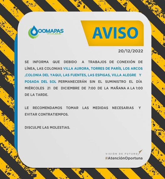 Aviso importante de OOMAPASC a colonias de Ciudad Obregón