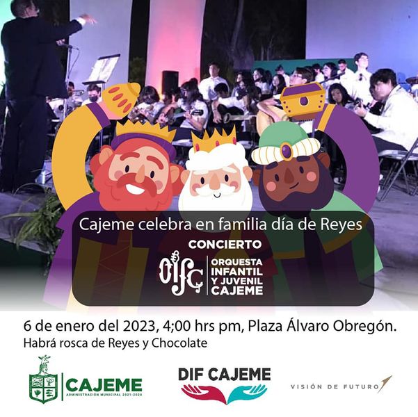 El Gobierno Municipal a través de DIF Cajeme y la Subdirección de Cultura invitan al gran festejo por el Día de Reyes que se llevará a cabo el próximo viernes 6 de enero a partir de las 3:30 de la tarde en la Plaza Álvaro Obregón.