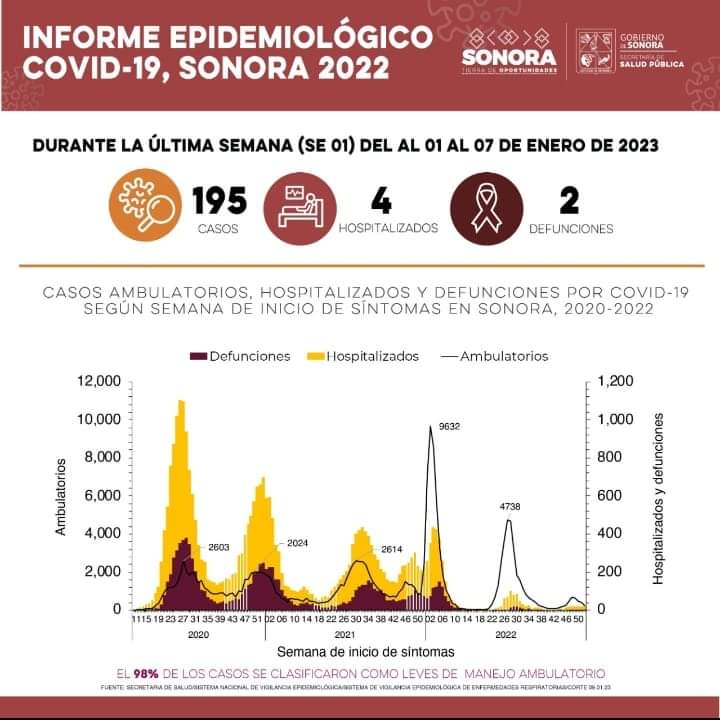Hermosillo.- La Secretaría de Salud confirmó 195 casos de Covid-19 y dos defunciones a causa de la enfermedad en la semana epidemiológica 1 del año, que abarca del 1 al 7 de enero.