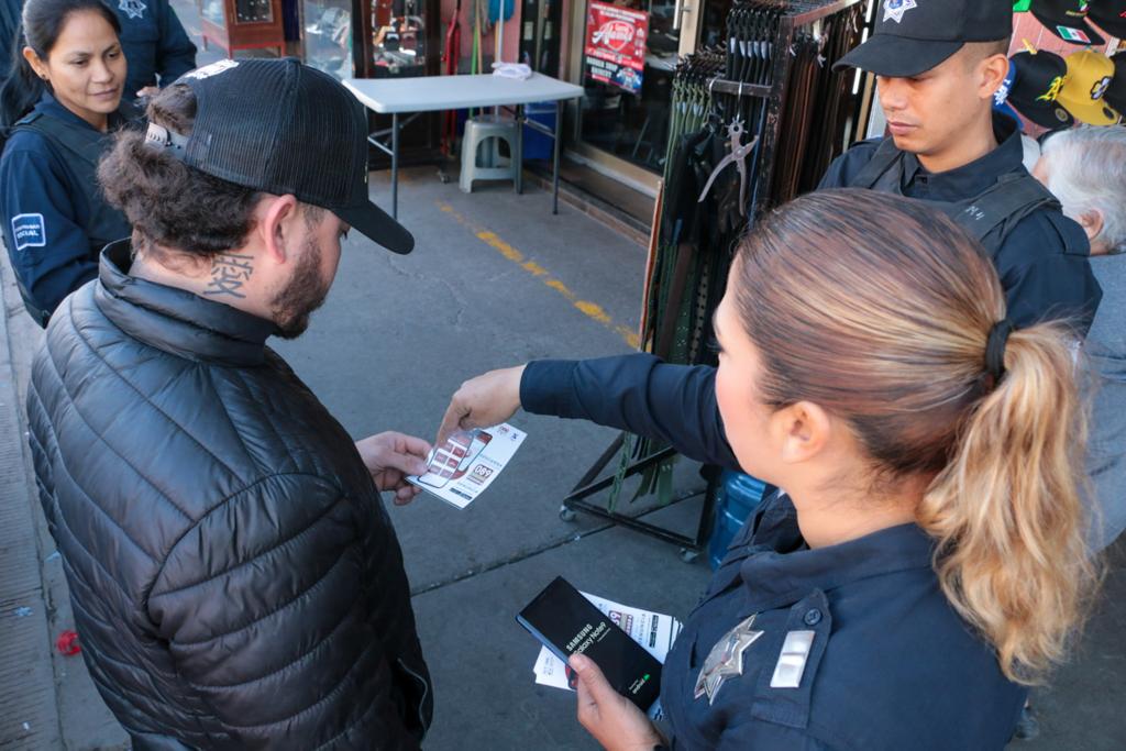 En fortalecimiento a las estrategias de seguridad que implementa la Policía Municipal, agentes comisionados al sector comercio visitaron el Mercajeme, donde tuvieron un acercamiento directo con comerciantes y ciudadanos, a quienes informaron sobre las aplicaciones gratuitas AntiExtorsión Sonora y Denuncia anónima.