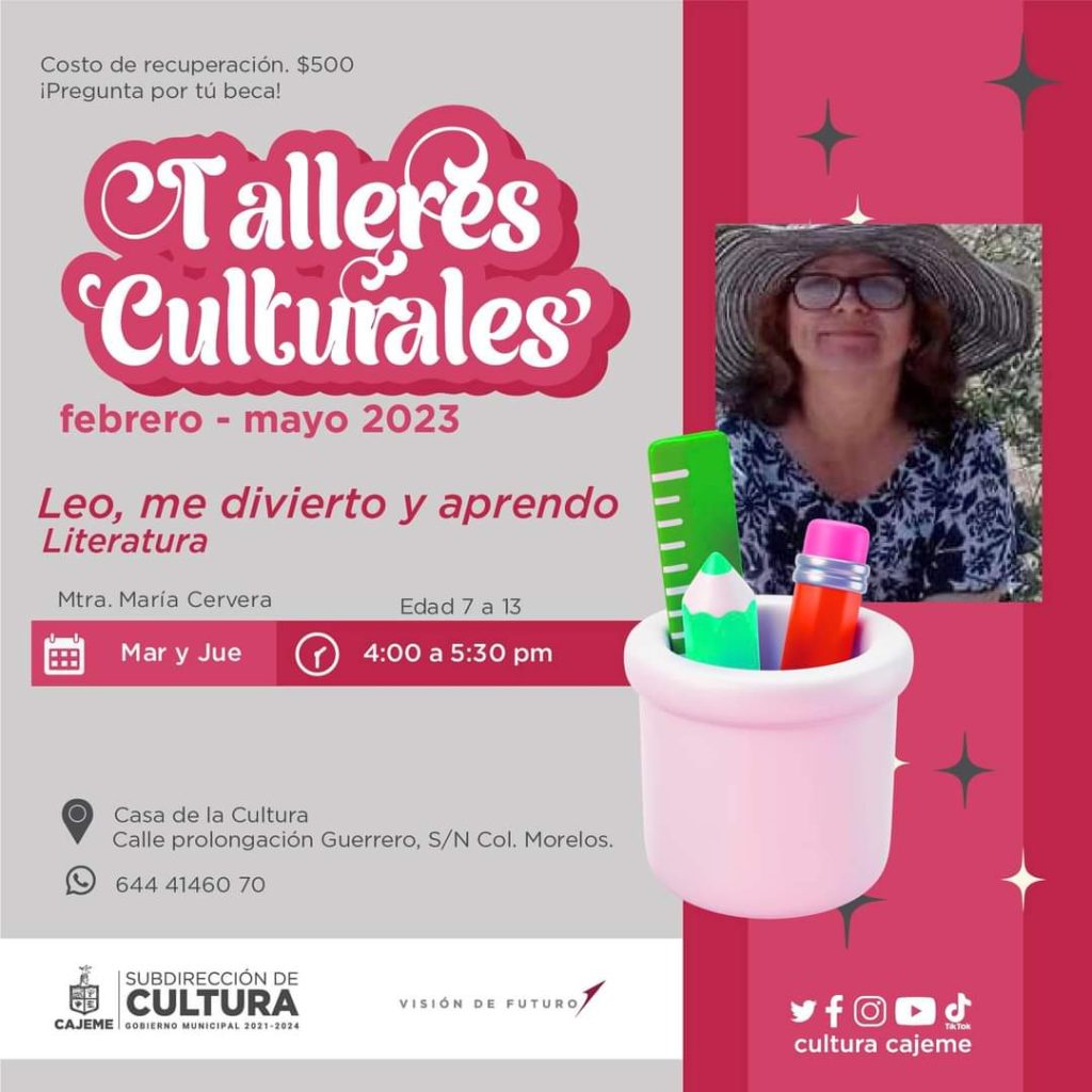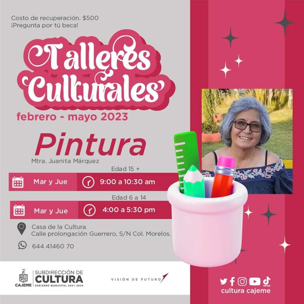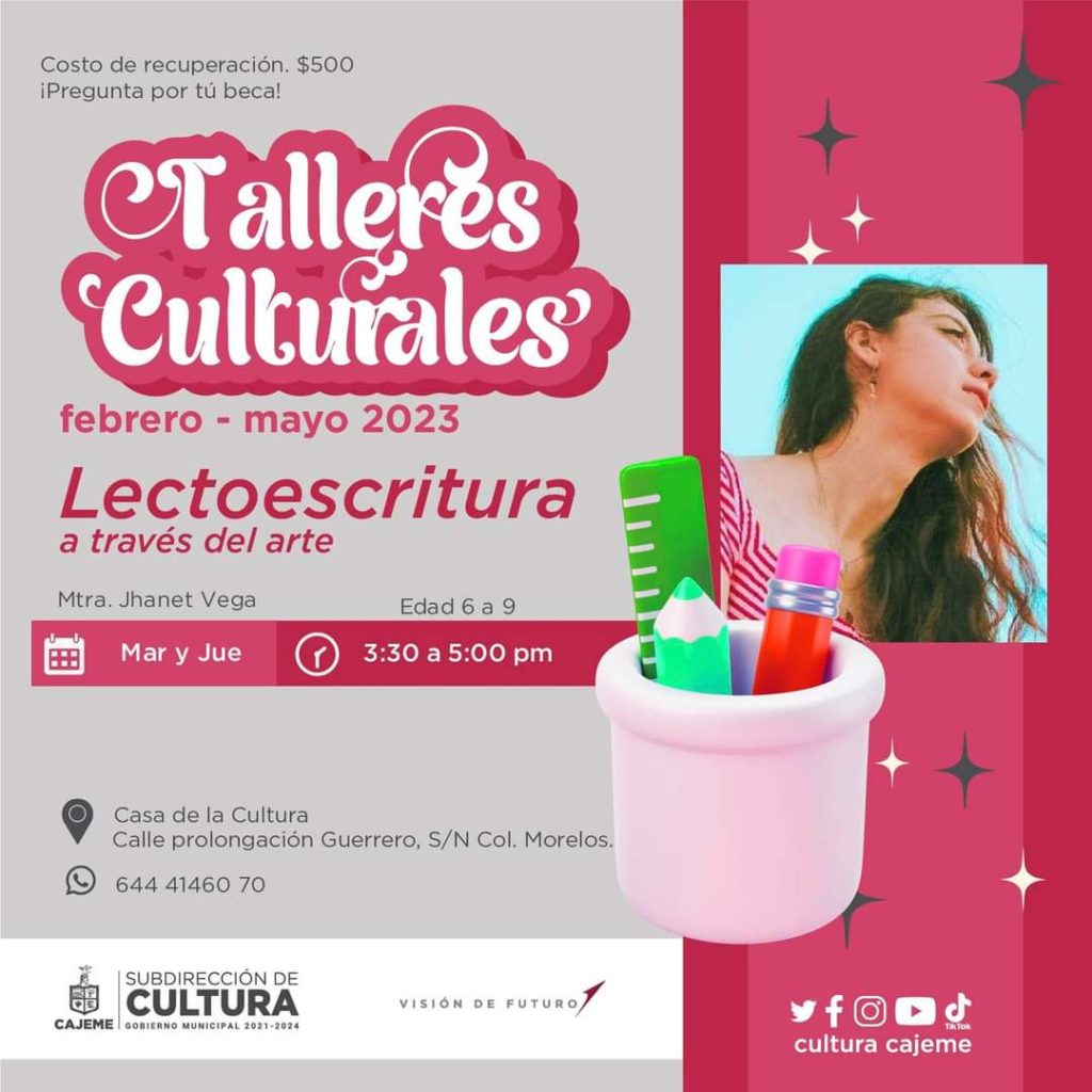 En consecuencia, la coordinadora cultural, Cynthia Salguero Ochoa invitó a niñas, niños y jóvenes a que se inscriban a los cursos y talleres de danza urbana, música, pintura, teatro, literatura, lectoescritura y Arteterapia, los cuales se impartirán en la Casa de la Cultura a partir del lunes 6 de febrero y concluyen el viernes 12 de mayo, con un costo mínimo de recuperación y 50 por ciento de inscripción. Para mayor información, comunicarse al teléfono 6444146070.