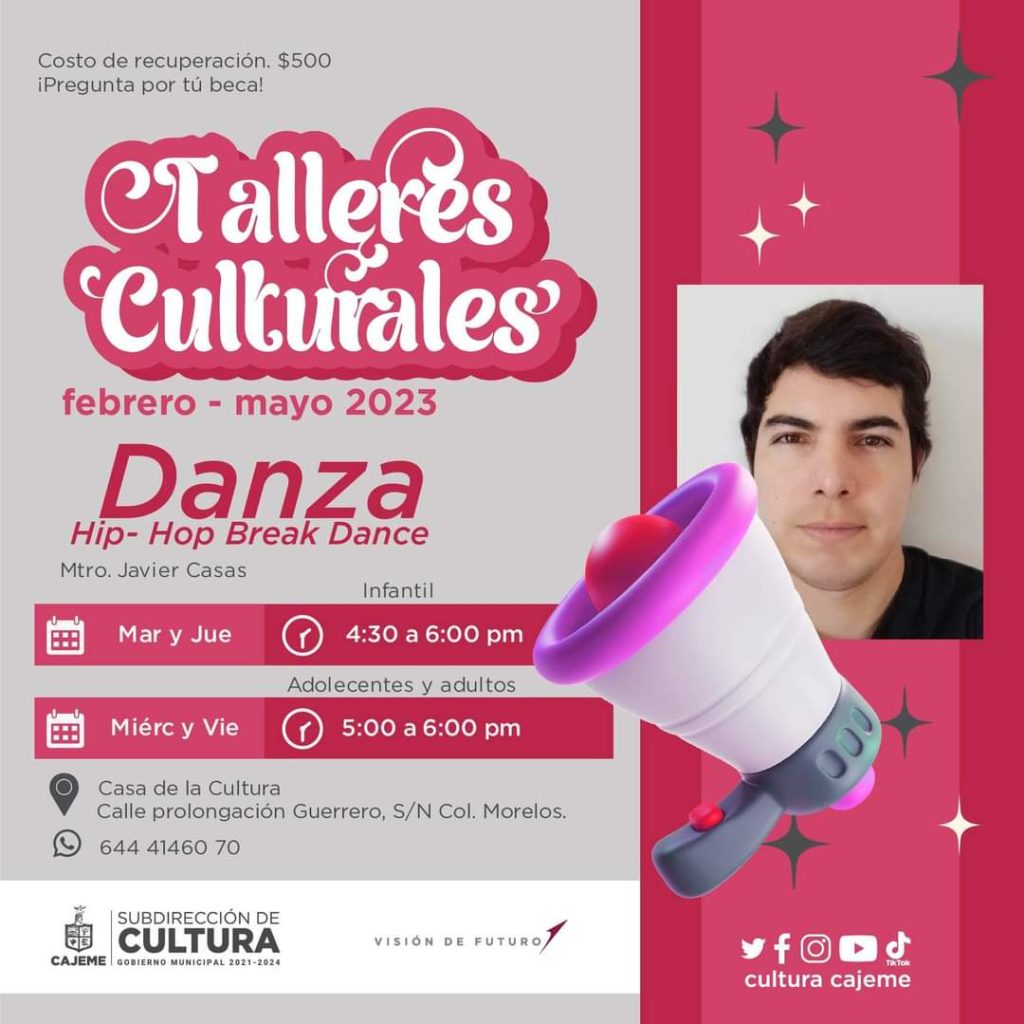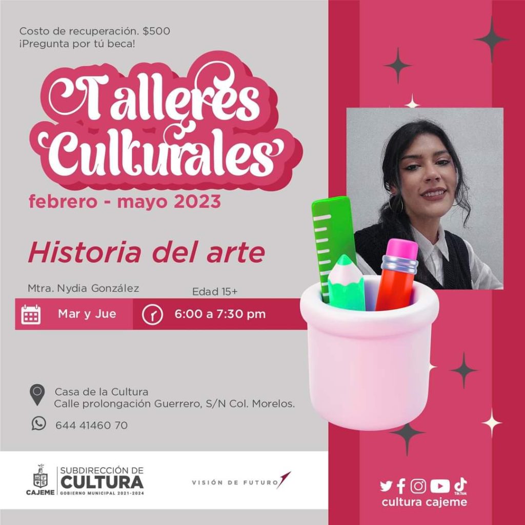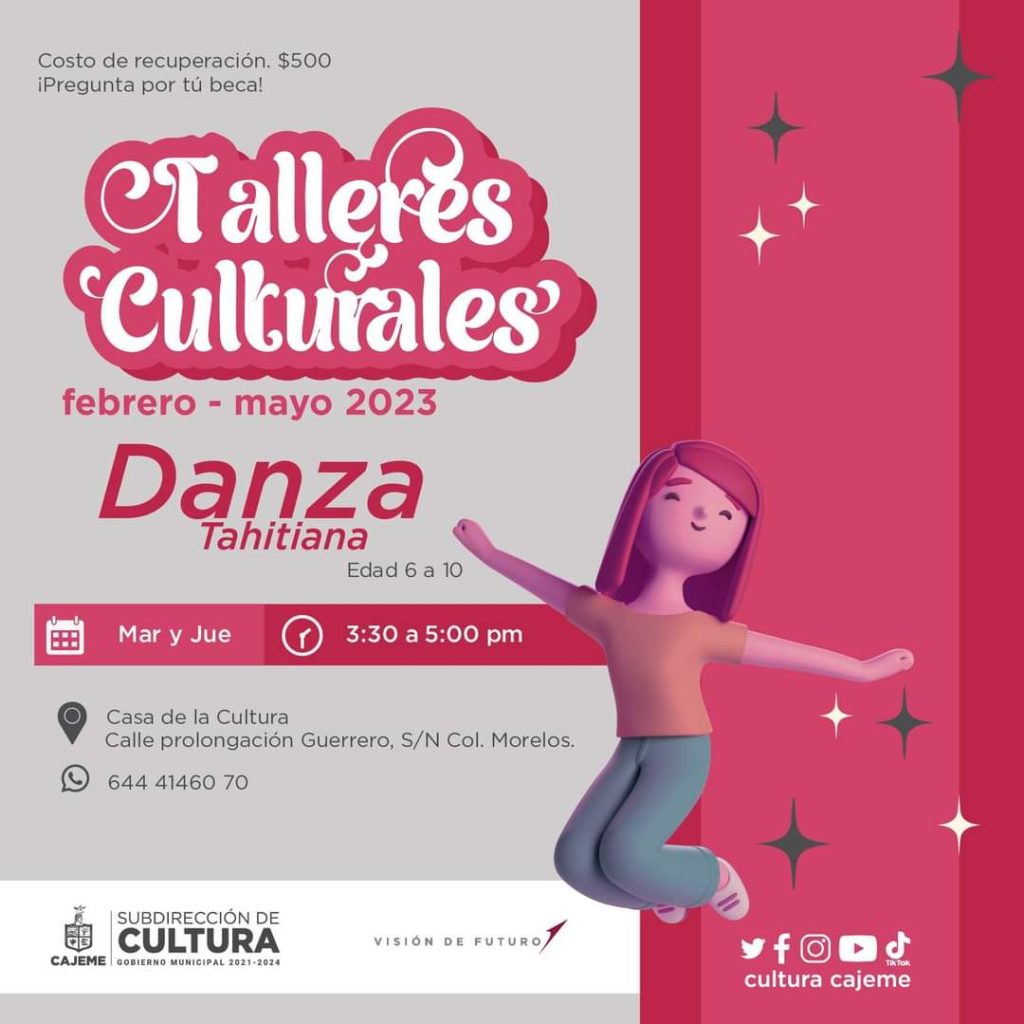 En consecuencia, la coordinadora cultural, Cynthia Salguero Ochoa invitó a niñas, niños y jóvenes a que se inscriban a los cursos y talleres de danza urbana, música, pintura, teatro, literatura, lectoescritura y Arteterapia, los cuales se impartirán en la Casa de la Cultura a partir del lunes 6 de febrero y concluyen el viernes 12 de mayo, con un costo mínimo de recuperación y 50 por ciento de inscripción. Para mayor información, comunicarse al teléfono 6444146070.