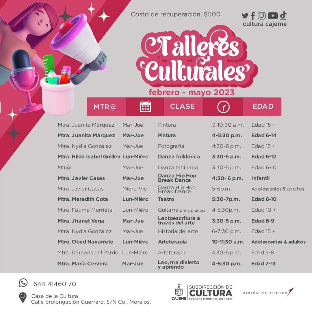 En consecuencia, la coordinadora cultural, Cynthia Salguero Ochoa invitó a niñas, niños y jóvenes a que se inscriban a los cursos y talleres de danza urbana, música, pintura, teatro, literatura, lectoescritura y Arteterapia, los cuales se impartirán en la Casa de la Cultura a partir del lunes 6 de febrero y concluyen el viernes 12 de mayo, con un costo mínimo de recuperación y 50 por ciento de inscripción. Para mayor información, comunicarse al teléfono 6444146070.