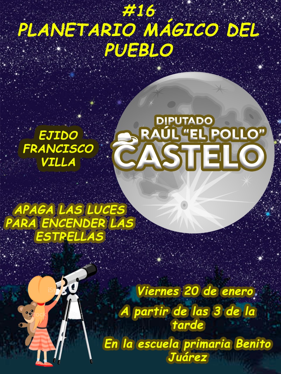 El ejido Francisco Villa recibirá al equipo del “Planetario Mágico del Pueblo” este 20 de enero a partir de las 3 de la tarde… No faltes, tendremos muchas sorpresas, juegos mecánicos y de feria, botanas, cena, películas, palomitas, refrescos, piñatas, en fin diversión sin límites y por supuesto la atracción principal, observar las estrellas a través de nuestro gran telescopio, todo esto y más gracias a la iniciativa del diputado Raúl “El Pollo” Castelo. Te esperamos con toda tu familia.