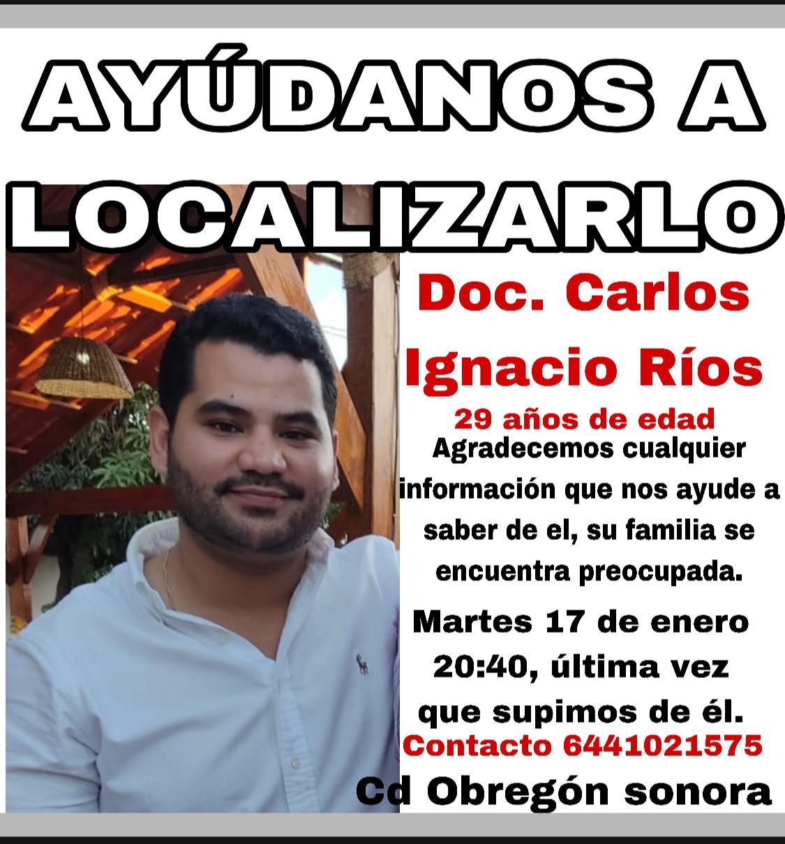 SI FAMILIA SOLICITAN AYUDA DE LA CIUDADANÍA PARA DAR CON EL PARADERO DE CARLOS IGNACIO RÍOS.