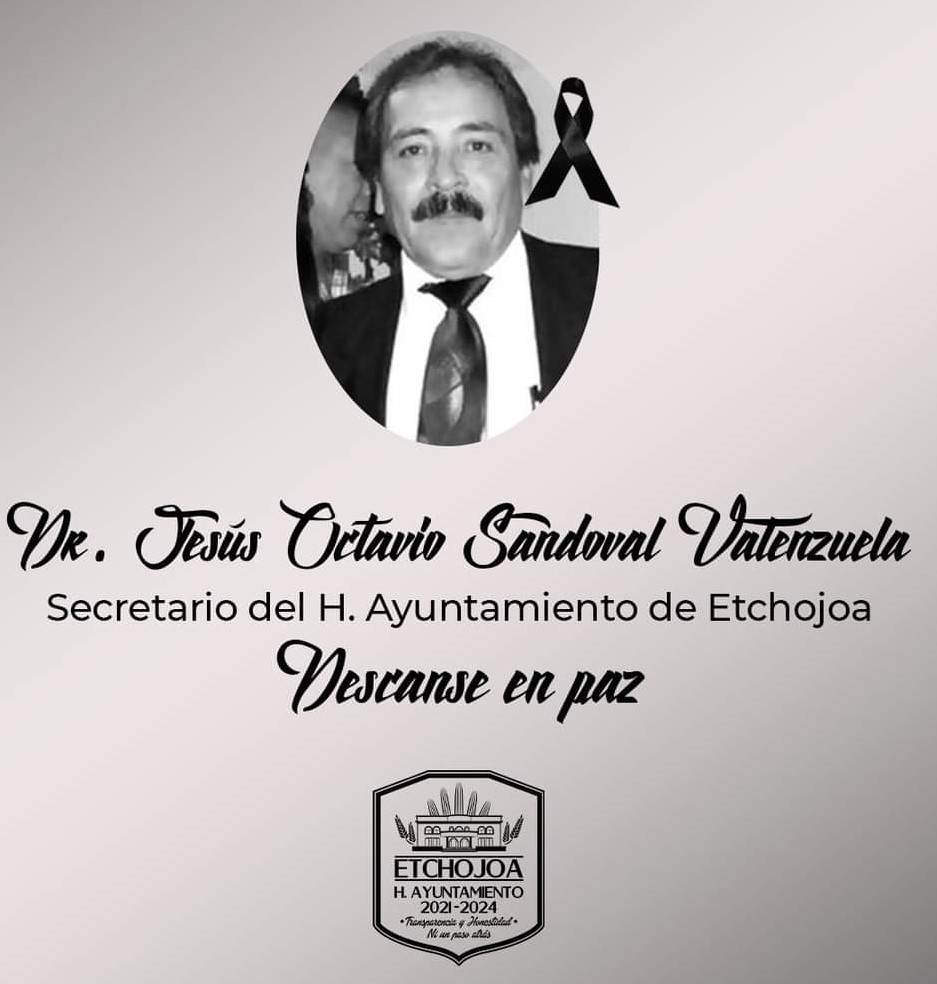 El Ayuntamiento de Etchojoa confirmó la muerte de su secretario, Jesús Octavio Sandoval Valenzuela, mientras recibía atención médica por complicaciones de salud.