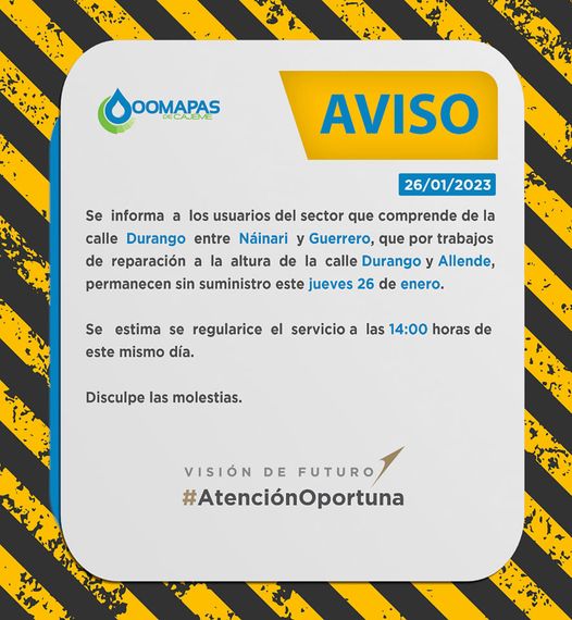 A los usuarios del sector que comprende de la calle Durango entre Náinari y Guerrero, permanecen sin suministro por trabajos de reparación de fuga de agua, se estima se regularice el servicio este mismo jueves 26 de enero a las 2 de la tarde⚠️ disculpe las molestias