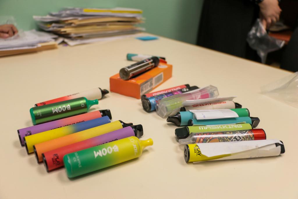 Plumones de aceite, cigarros electrónicos, navajas y pistolas de juguete, fueron algunos de los objetos que se localizaron como parte de las 2 mil 252 mochilas que se revisaron en cinco planteles educativos de nivel secundaria.