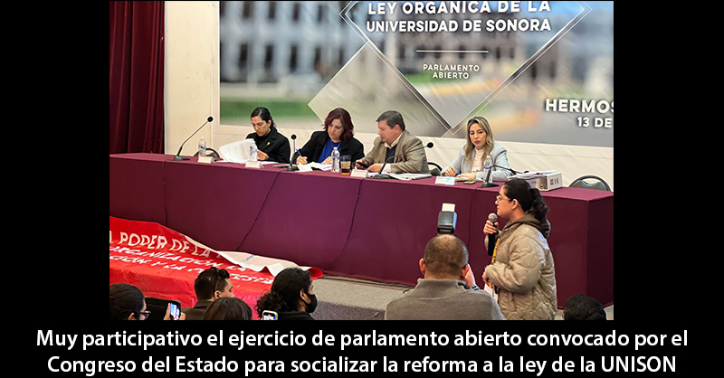 Valga este breve contexto para aludir al proceso de socialización que bajo la figura del Parlamento Abierto se lleva a cabo con motivo de la propuesta de modernización del marco jurídico de la Universidad de Sonora, ejercicio que este lunes se llevó a cabo en el pequeño auditorio de la Sociedad Sonorense de historia, presidido por el diputado Jacobo Mendoza Ruiz, con la asistencia también de las diputadas Karina Zárate, Beatriz Cota Ponce y Celeste Taddei.