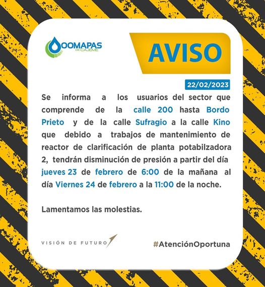Debido a trabajos de mantenimiento 🧑🔧en el reactor de clarificación 💧 de planta potabilizadora 2, permanecerán con baja presión a partir del día jueves 23 de febrero de ⏰ 6:00 de la mañana ☀️ a 11:00 de la noche 🌘del viernes 24 de febrero.