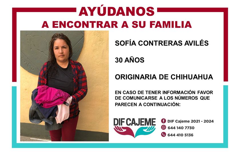 Sofía Contreras Avilés es una mujer de 30 años, originaria de Chihuahua. Agradecemos cualquier tipo de información que nos ayude a localizar a su familia, favor de comunicarse a los números señalados en la imagen.