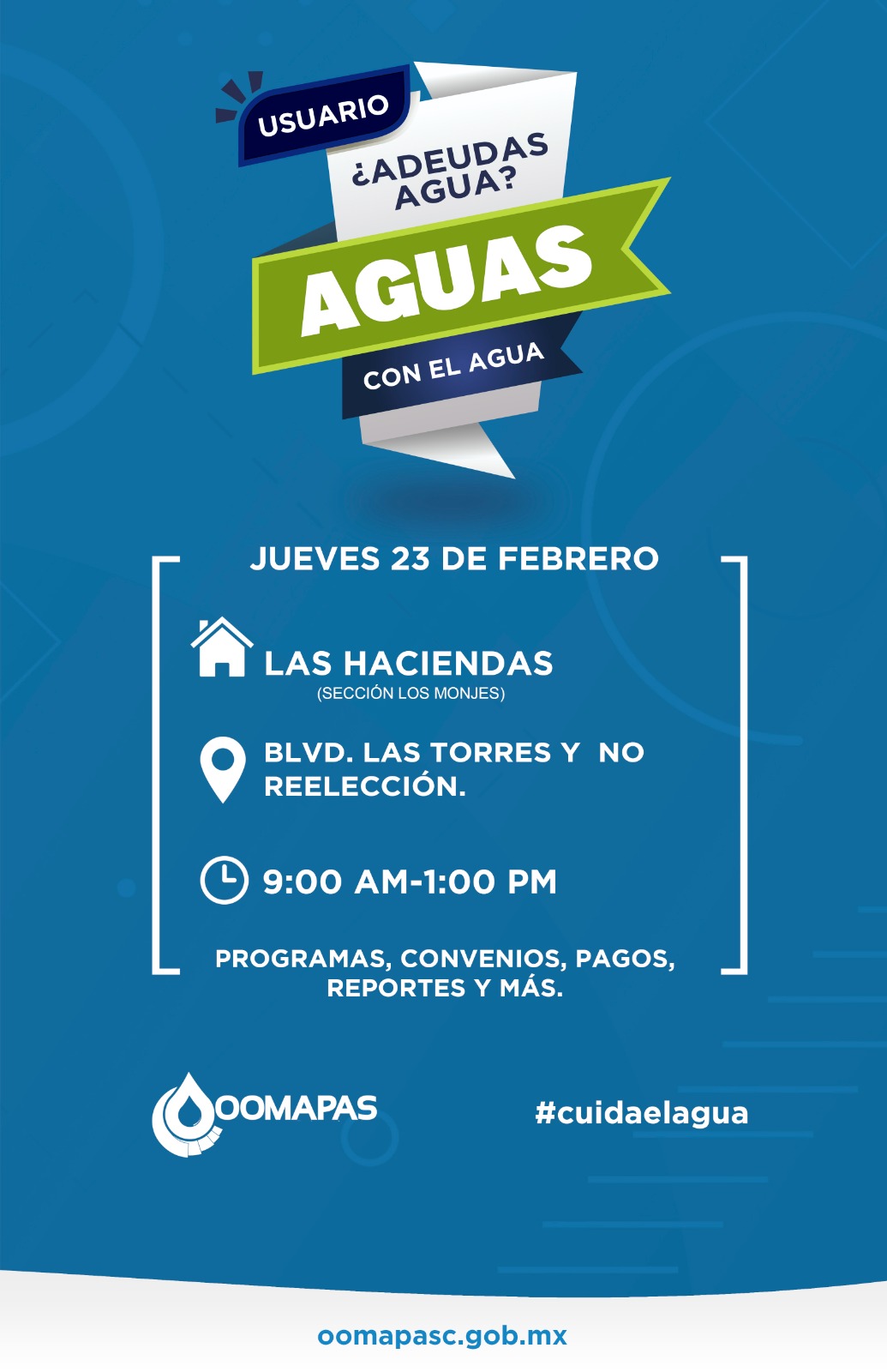 El OOMAPAS de Cajeme los invita este jueves 23 de febrero de 09:00 AM a 01:00 PM en Blvd. Las Torres y No Reelección 🏠 a nuestro módulo de atención👩💻🧑💻 donde podrás encontrar programas sociales y un traje a tú medida para regularizar tú recibo de agua💦