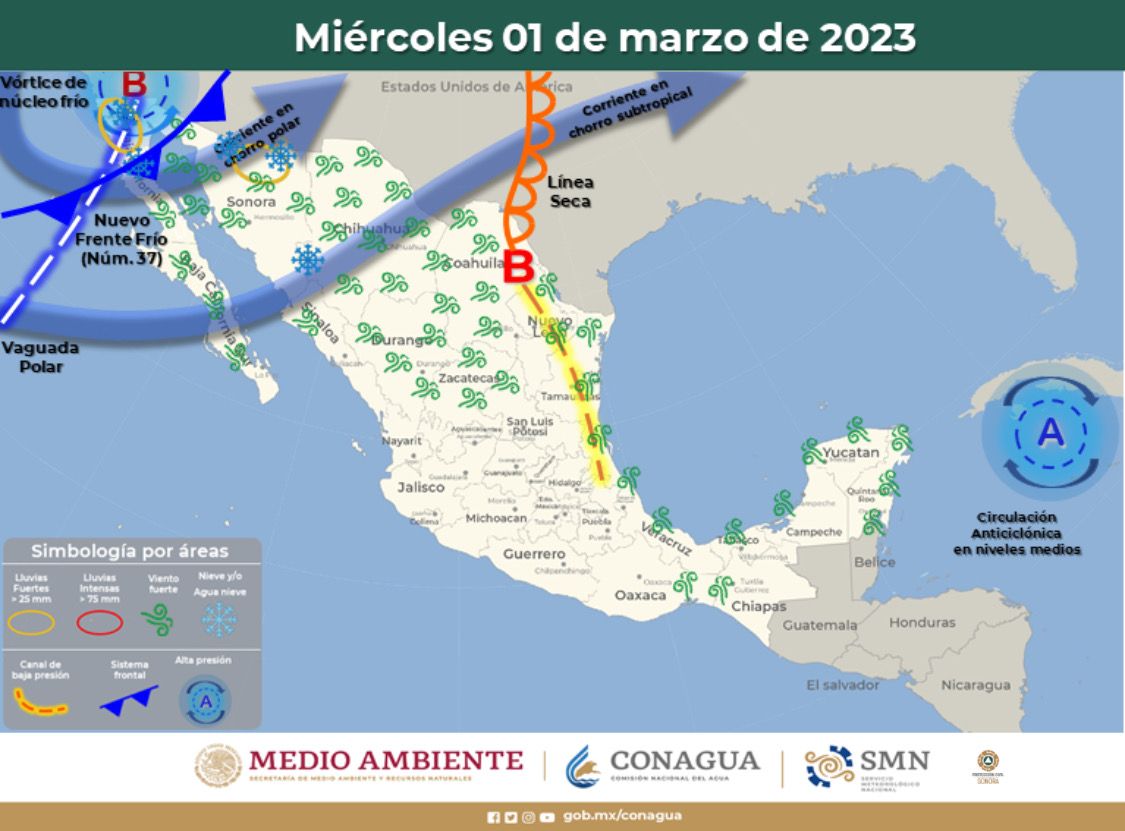 Hermosillo.- Se espera que mañana miércoles por la tarde ingrese, por el noroeste de Sonora, el frente frío 37, asociado a un vórtice de núcleo frío y la corriente en chorro polar, con probabilidad de lluvias dispersas en los municipios del noroeste, norte, noreste y oriente, así como caída de aguanieve o nieve, en los municipios del norte, noreste y oriente.