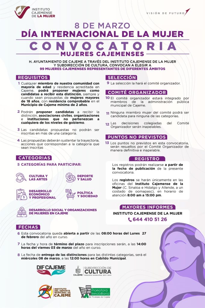El miércoles 8 de marzo, Día Internacional de la Mujer, se entregará reconocimiento a las mujeres cajemenses destacadas en diversas acciones, tales como Cultura y Artes, Deporte y Salud, Desarrollo Social y Organización de Mujeres en Cajeme, Desarrollo Económico y Profesional, así como en Política y Sociedad, para ello el ICM convoca a la comunidad a proponer desde este día a candidatas a recibir esta distinción, siempre y cuando las propuestas sean de mujeres mayores de 18 años y con residencia de por lo menos dos años en el municipio, las inscripciones cierran el viernes de 3 de marzo, para mayores informes pueden llamar al teléfono 644 410 5126.