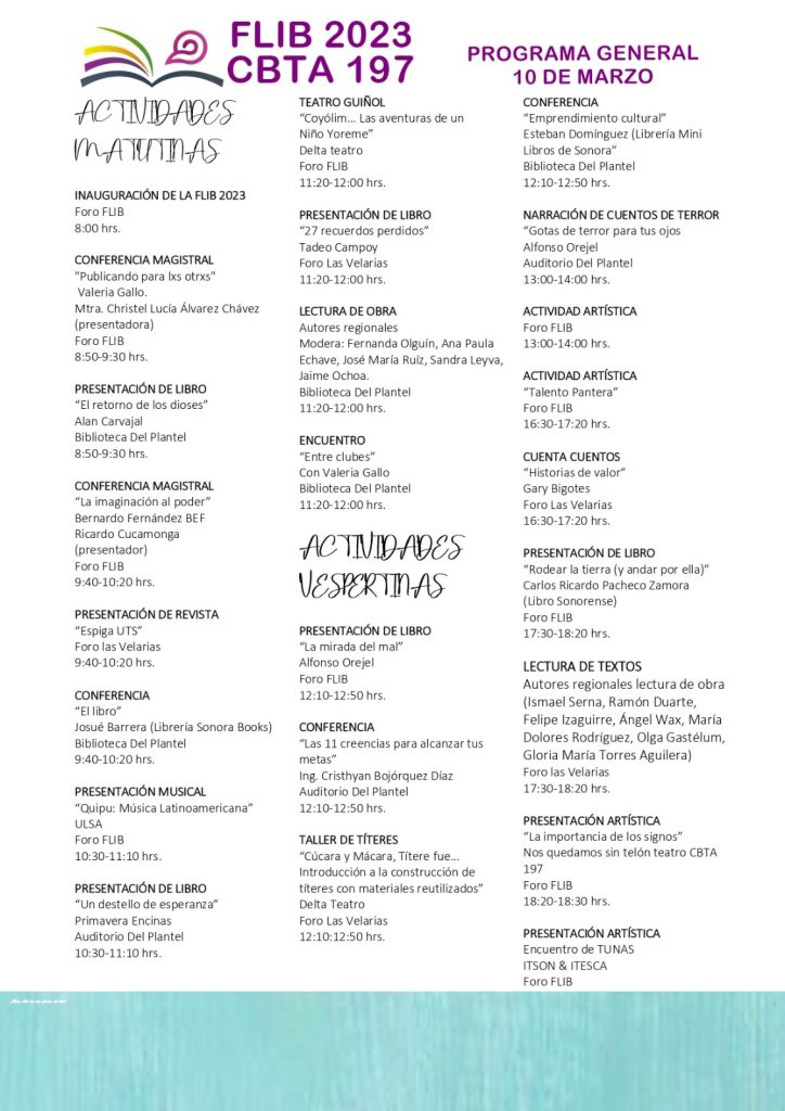 La directora del CBTA 197, Clarissa Márquez, informó que esta feria del libro estará integrada por escritores de talla nacional, quienes realizarán sus presentaciones en un horario de 8 de la mañana a 8 de la noche, con actividades como conferencias, presentaciones, teatro, lecturas y encuentros, todo esto impartido por diferentes invitados como Ricardo Cucamonga, autor de Cindy La Regia, Valeria Gallo, Alan Carvajal, Bernardo Fernández, Josué Barrera, ULSA, Primavera Encinas, Delta Teatro, Tadeo Campoy, Fernanda Olguín, Ana Paula Echave, José María Ruiz, Sandra Leyva y Jaime Ochoa.