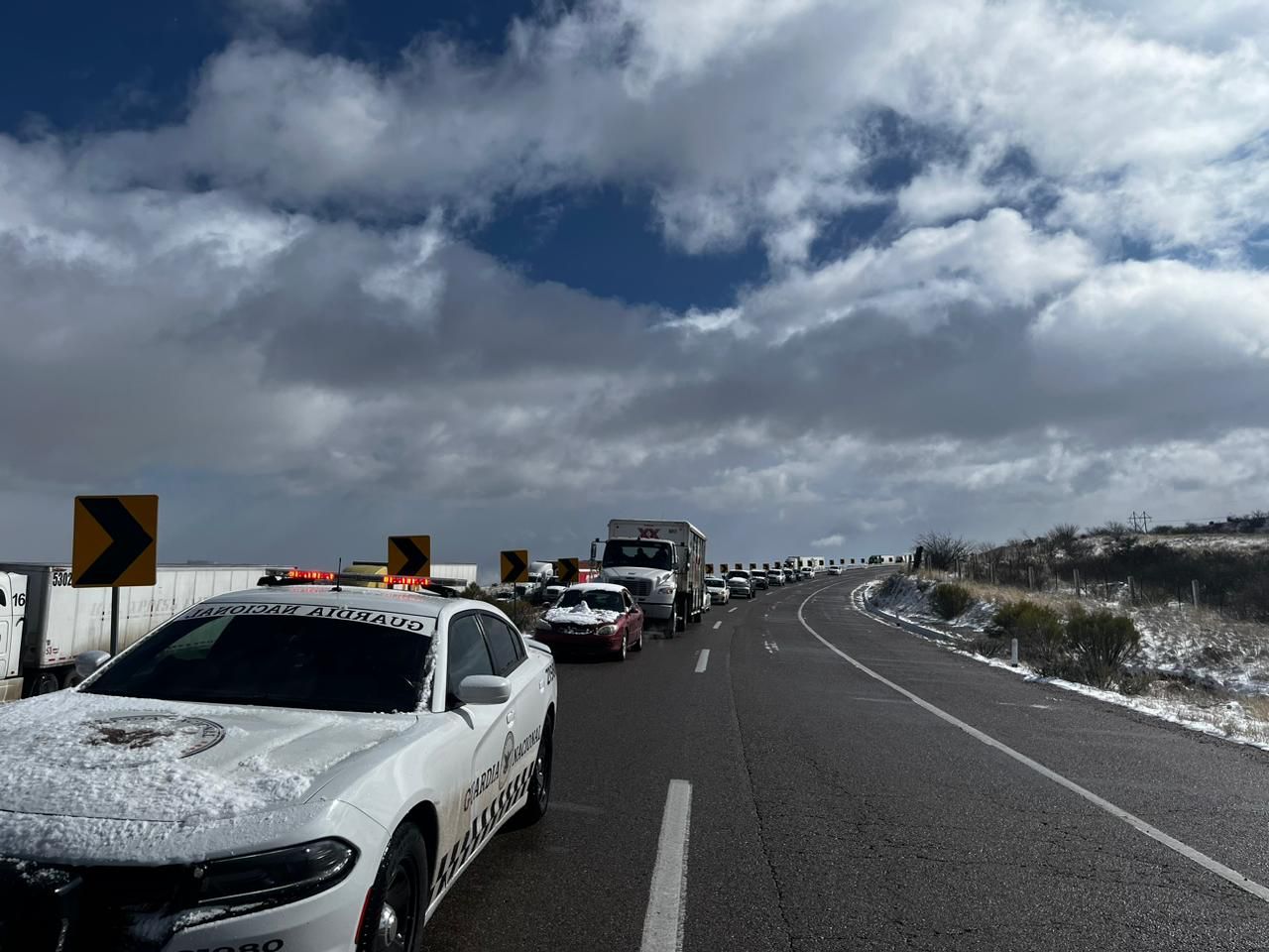 Reporta Guardia Nacional y Protección Civil Sonora que se abre a la circulación el tramo carretero Cananea – Agua Prieta tras intensa nevada, los tramos Ímuris – Cananea y Agua Prieta – Janos se mantienen cerrados de momento.
