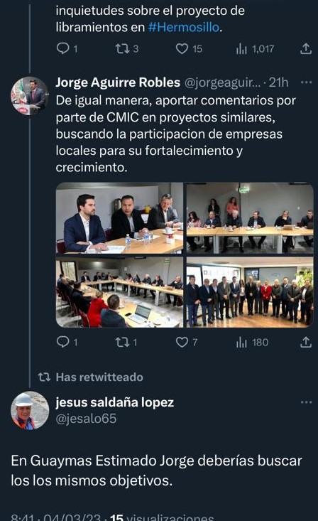Pero la historia completa comienza a platicarse cuando al mensaje en la red social, el constructor guaymense Jesús Saldaña López (@Jesalo65), le pide –¿cuestiona?—que “en Guaymas, estimado Jorge, deberías buscar los mismos objetivos”.