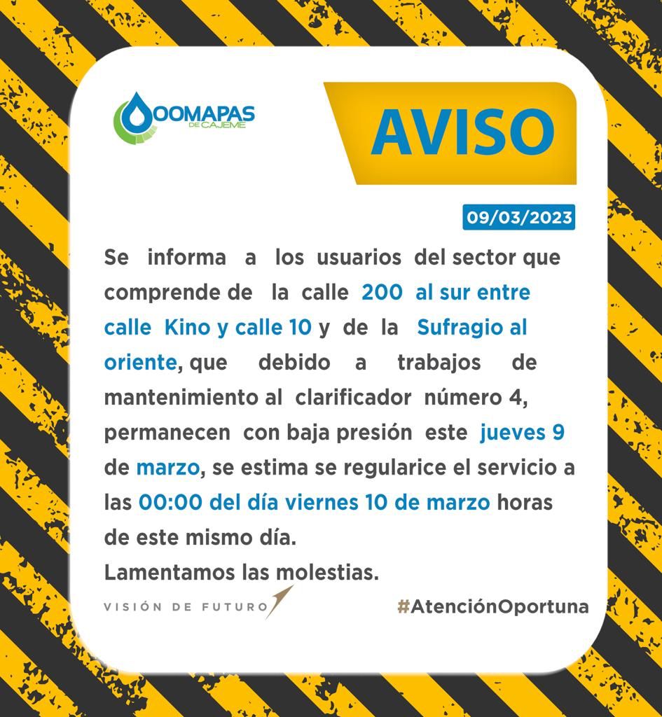 Debido a trabajos de mantenimiento en el claroficador número 4💧, permanecen con baja presión 💦, este jueves 9 de marzo, se estima se regularice el servicio a las 00:00 horas del día viernes 10 de marzo.