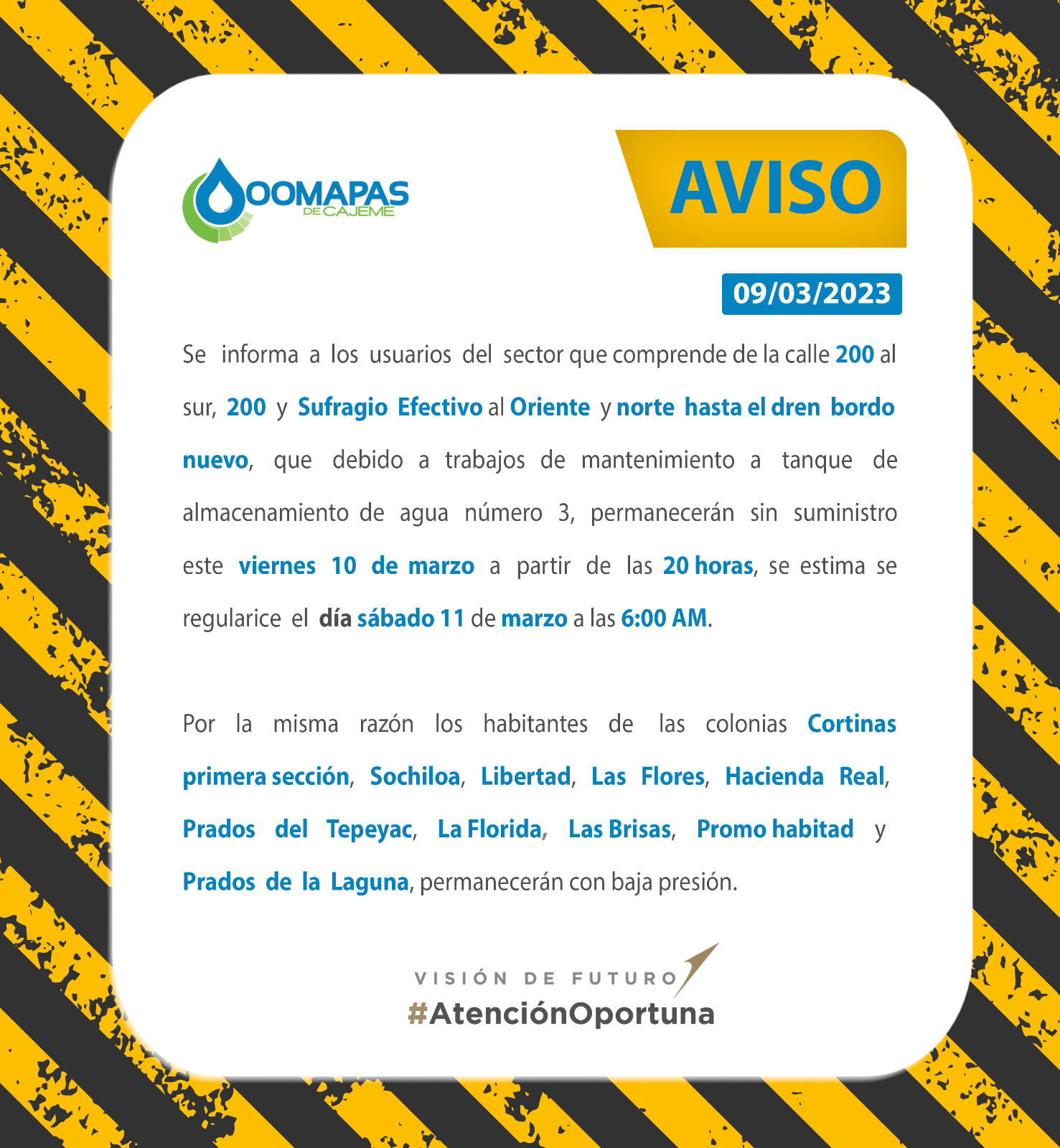 Debido a trabajos de mantenimiento a tanque de almacenamiento de agua número 3, permanecerán sin suministro 🚱este 🗓️viernes 10 de marzo a partir de las 🕤20 horas, se estima se regularice servicio 🚰 el día 🗓️sábado 11 de marzo a las 🕤6:00 AM.