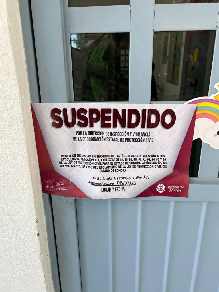 Hermosillo.- Con base en denuncias del programa “Inspector Ciudadano” y mediante una estrecha colaboración con el Sistema de Desarrollo Integral de la Familia (DIF nacional), el Gobierno de Sonora, a través de la Dirección de Inspección y Vigilancia de Protección Civil estatal, cerró tres estancias infantiles más, para llegar a cinco en lo que va del año 2023.
