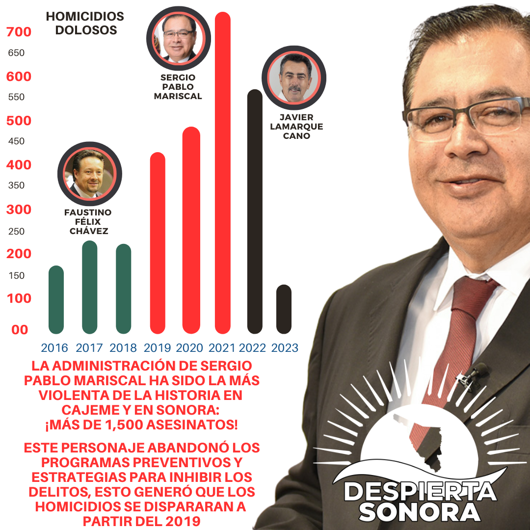 De 2016 a lo que va del 2023 en Cajeme se han registrado más de 2,900 asesinatos, de los cuales más del 50 por ciento se cometieron en el gobierno de Sergio Pablo Mariscal Alvarado, el cual pasó a ser el más violento de la historia con más de 1,500 homicidios dolosos, cifra nunca antes vista en ningún municipio de Sonora, lo que además llevó, al salir de su administración, a Ciudad Obregón del lugar 31 en 2018 al número 02 en el ranking de ciudades más peligrosas del mundo.