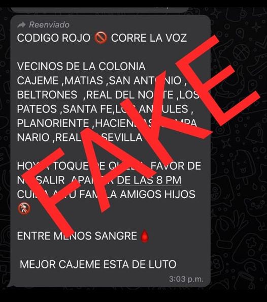 La Secretaría de Seguridad Pública Municipal de Cajeme da a conocer que la información que circula a través de redes sociales, en donde se menciona un “código rojo” en diversos sectores de la ciudad es totalmente falsa.