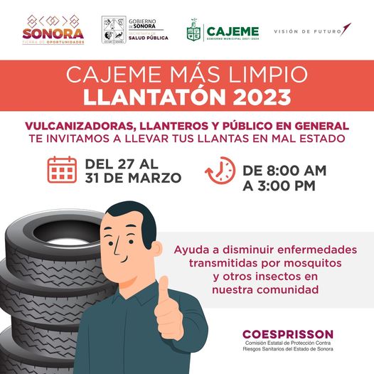 Llantón 2023 en conjunto con COESPRISSON, gobierno del estado, secretaria de seguridad pública y el gobierno municipal hacen la invitación a vulcanizadoras, llanteros y público en general a llevar sus llantas en mal estado a los diferentes centros de acopio dentro de los días 27-31 de marzo de 8:00 am a 3:00 pm.
