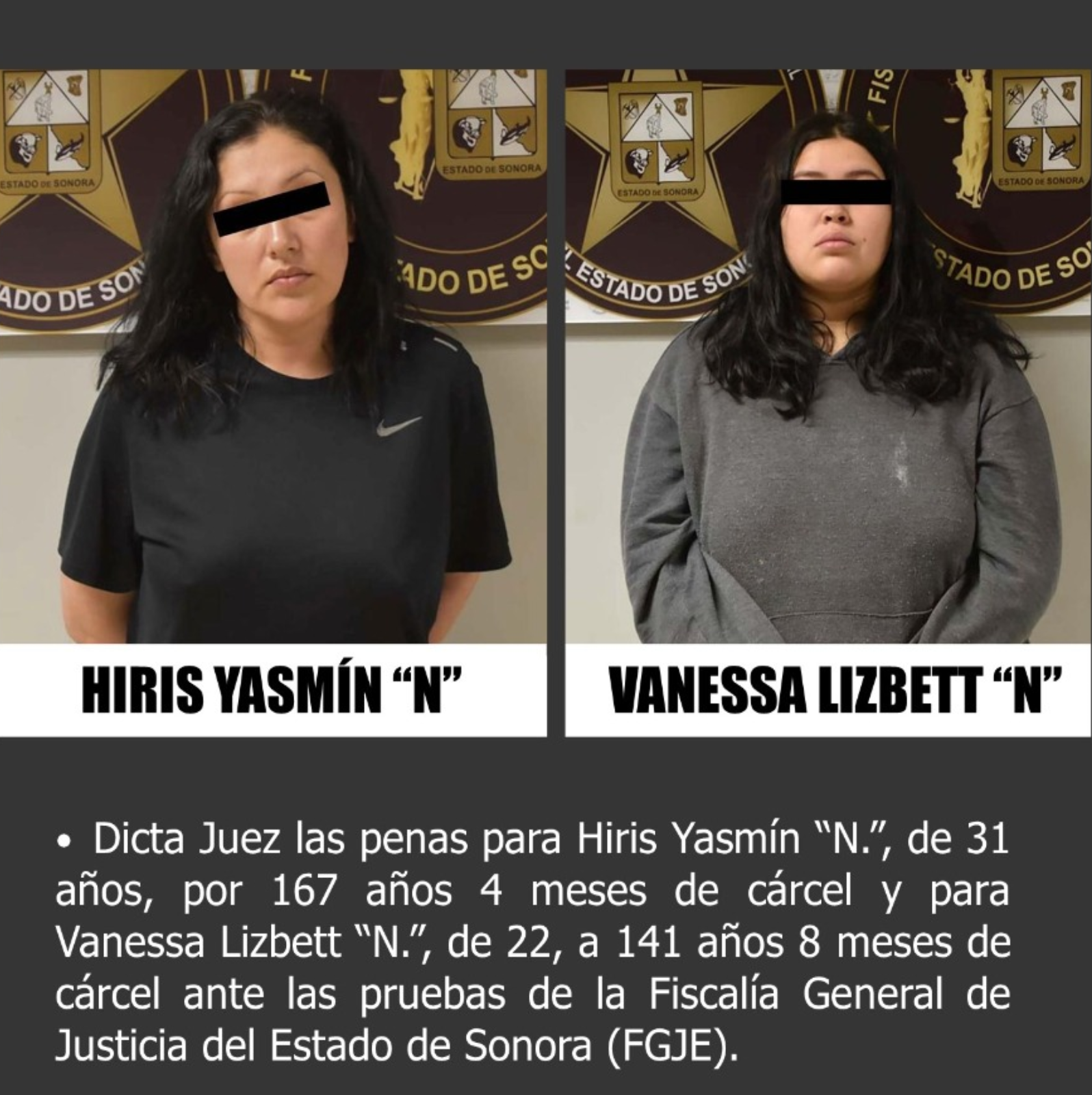 Por los delitos de feminicidio, tentativa de feminicidio, secuestro y robo agravado el Juez dictó sentencias condenatorias para Hiris Yasmín “N.”, de 31 años, a 167 años 4 meses de prisión y para Vanessa Lizbett “N.”, de 22, a 141 años 8 meses de cárcel.