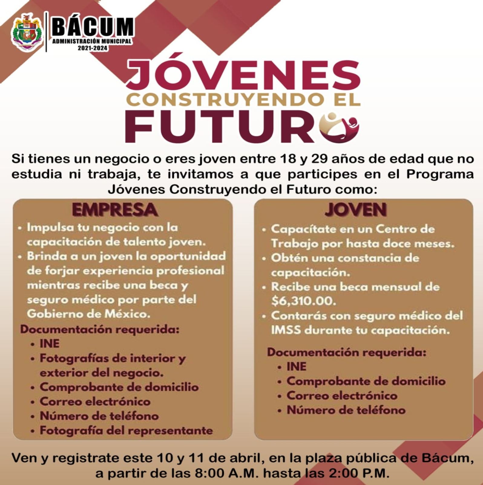 Se les informa que estará el módulo de Jóvenes construyendo el futuro en la plaza pública de Bácum, para realizar tu registro como empresa o si tienes entre 18 y 29 años también puedes ser parte como becario