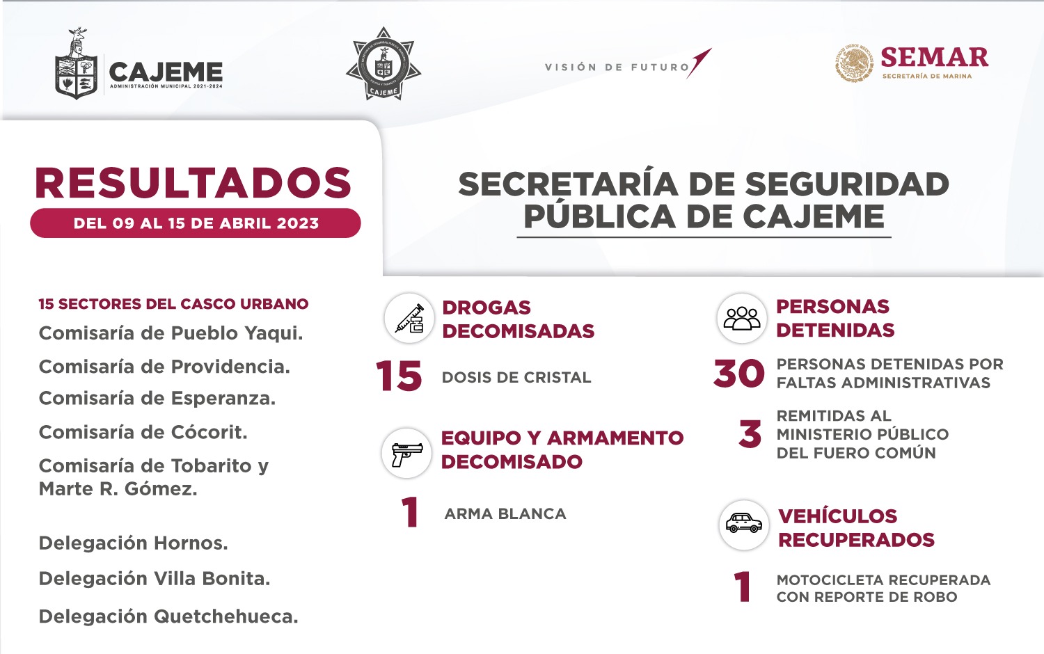 Las acciones de la Secretaría de Seguridad Pública en Cajeme dieron como resultado un total de 33 personas detenidas por elementos de la Policía Municipal en coordinación con la Secretaría de Marina y las diversas corporaciones, de los cuales 20 fueron por faltas administrativas y 3 se turnaron al Ministerio Público del Fuero Común.