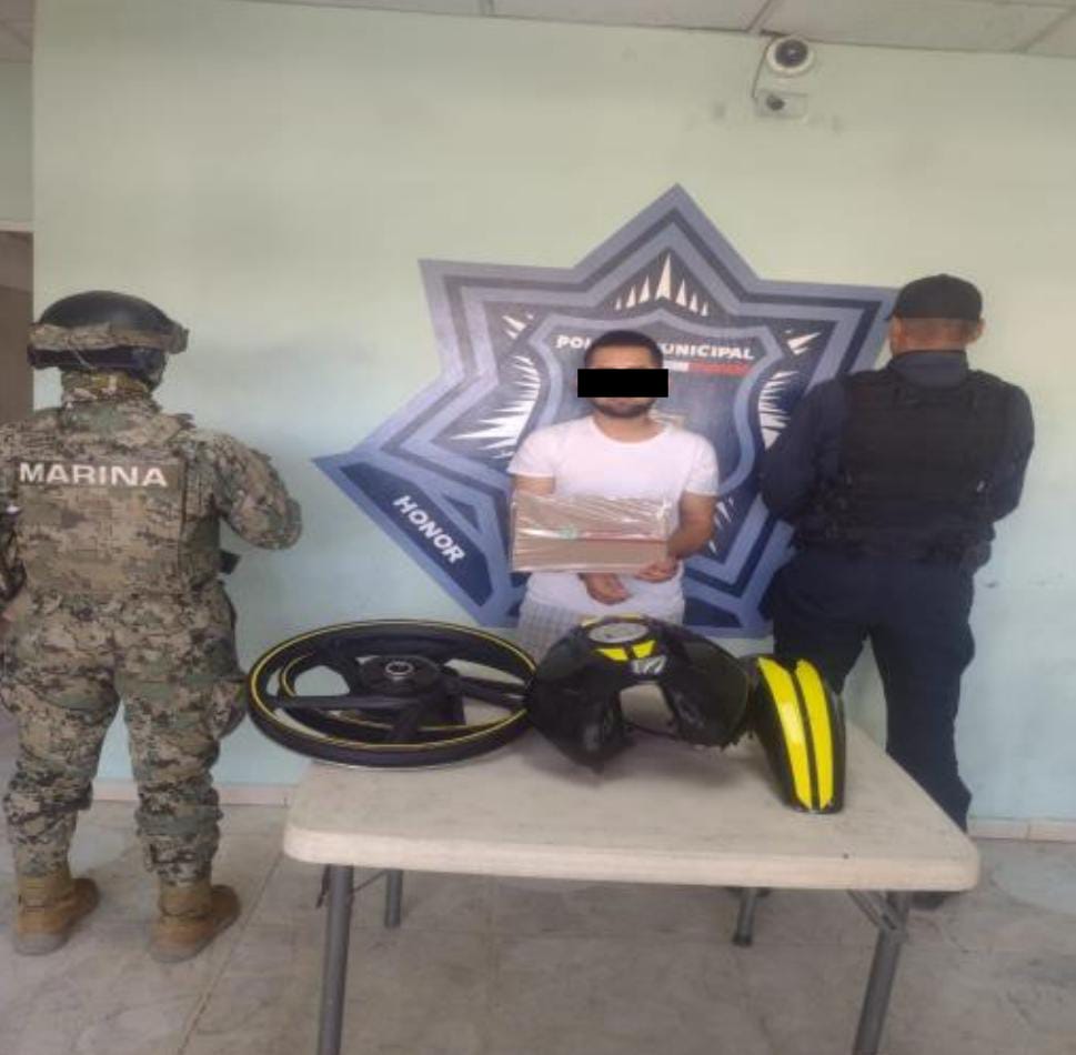 La detención se realizó alrededor de las 15:13 horas del jueves, por la calle Topacio entre Ejército Nacional y Horus de mencionado sector, donde elementos atendieron el reporte de un ciudadano quien les informó que había visto minutos atrás a un sujeto cargando en sus manos piezas de motocicletas y portando un arma blanca.