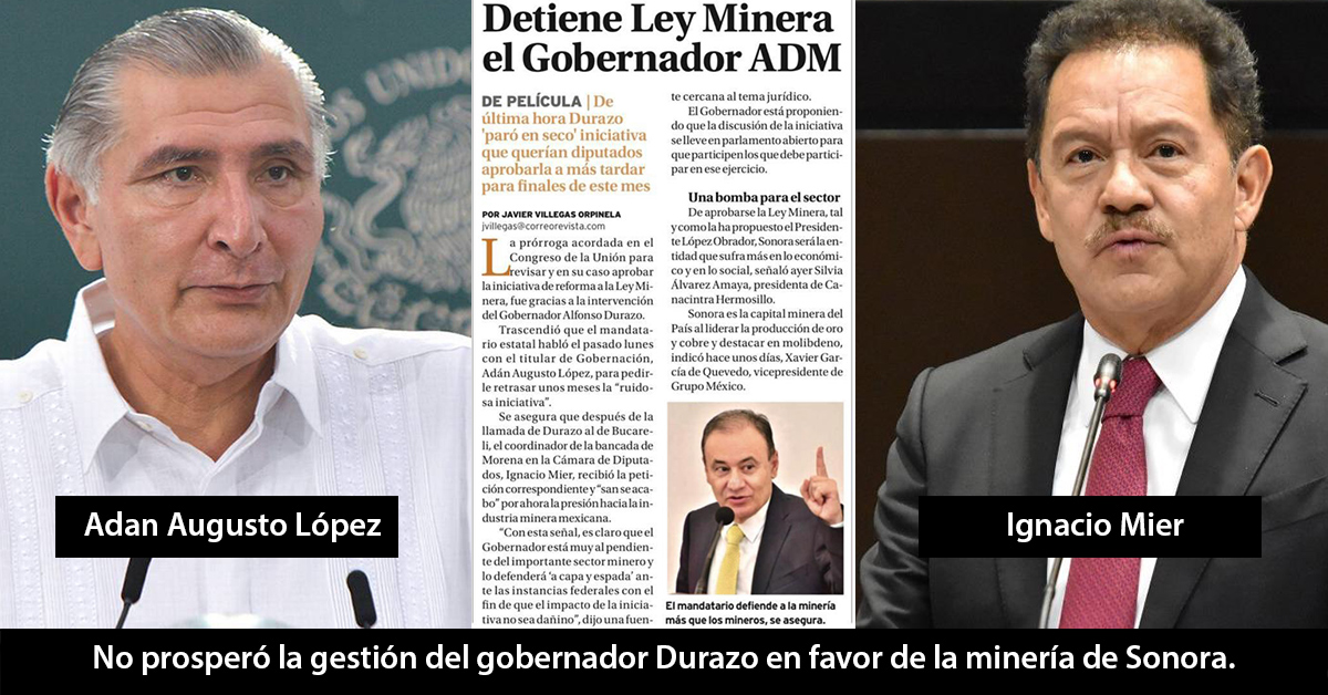 Dadas las influencias que goza el gobernador de Sonora, Alfonso Durazo Montaño por su cercanía al presidente Andrés Manuel López Obrador y su poderosa posición como presidente del Consejo Nacional de MORENA, creímos que sería pan comido el que se difiriera hasta septiembre el trámite legislativo de la reforma a la Ley Minera.