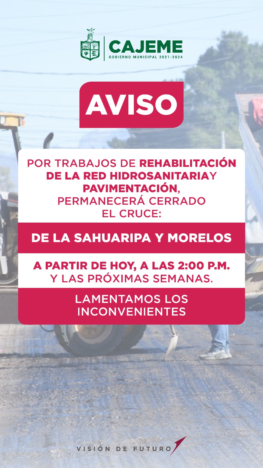 A partir de hoy a las 2 de la tarde, el crucero de las calles Sahuaripa y Morelos estará cerrado por trabajos de rehabilitación vial. El Ayuntamiento de Cajeme solicita a los ciudadanos a que respeten los señalamientos viales y utilicen rutas alternas. Lamentamos las molestias que esto pudiera ocasionar. Gracias.