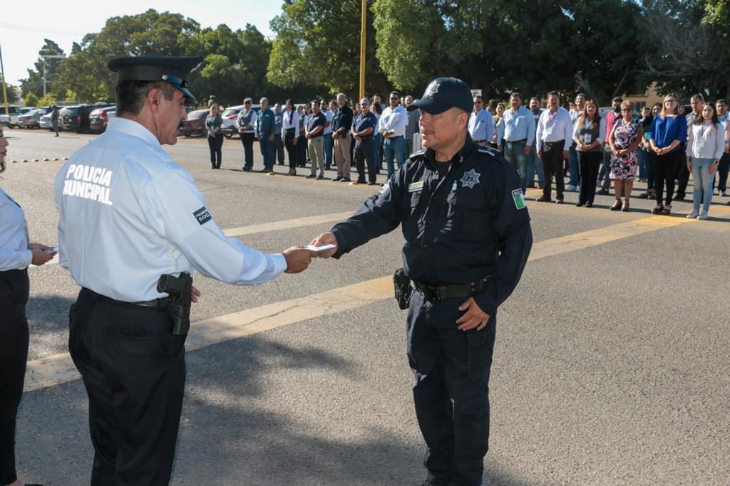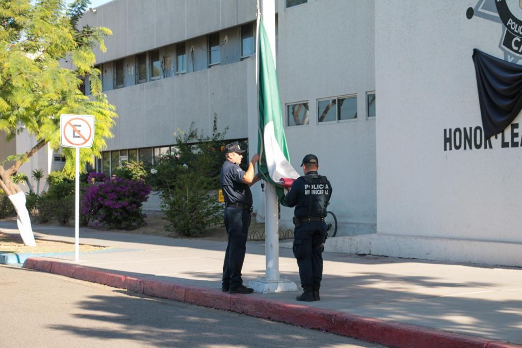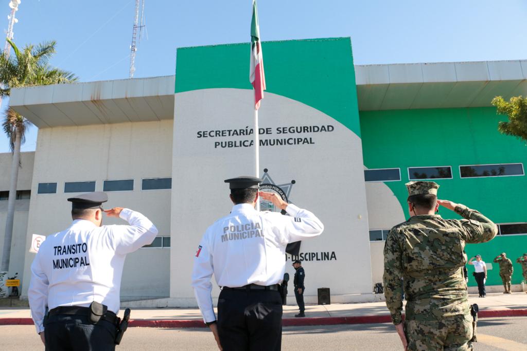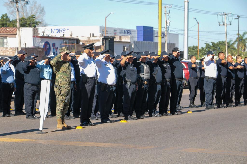 Encabezados por Claudio Cruz Hernández, Jefe de la Policía Preventiva y Tránsito Municipal en Cajeme, las y los elementos rindieron honores a la bandera entonando nuestro solemne himno nacional.