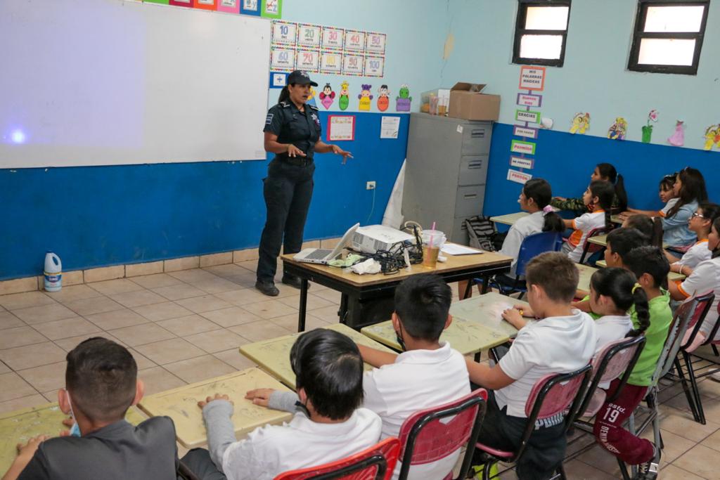 Las agentes de la Policía Municipal Gladys Virginia Palafox Zambrano y Edith Barragán Luzanilla, fueron quienes ofrecieron la plática a cerca de 40 estudiantes de nivel de educación básica en la colonia Urbi Villas del Rey.