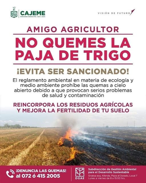 El reglamento ambientar en materia de ecología y medio ambiente prohíbe las quemas a cielo abierto debido a los problemas de salud y contaminación que provocan. Denuncia las quemas al 072 o al 4152005.