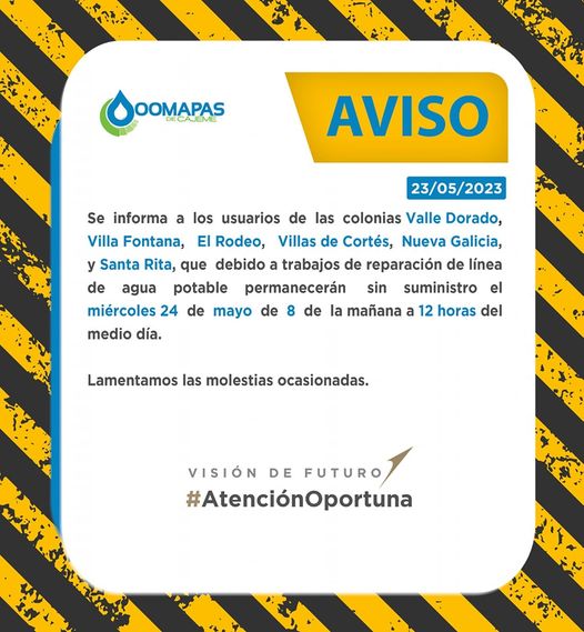Por reparación de línea de agua potable estarán sin servicio Valle Dorado, Villa Fontana, El Rodeo, Villa de Cortés, Nueva Galicia y Santa Rita