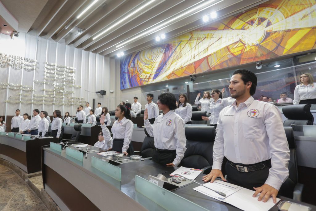 Los jóvenes, mujeres y hombres este día rindieron protesta ante la presidenta del Congreso, diputada Alejandra López Noriega, quien estuvo acompañada en la mesa directiva del recinto legislativo por Adolfo Salazar Razo, Secretario de Gobierno; Rosa María Mancha Ornelas, representante de la Secretaría de Educación y Cultura; Nery Ruiz Arvizu, presidente del Instituto Estatal Electoral y de Participación Ciudadana.