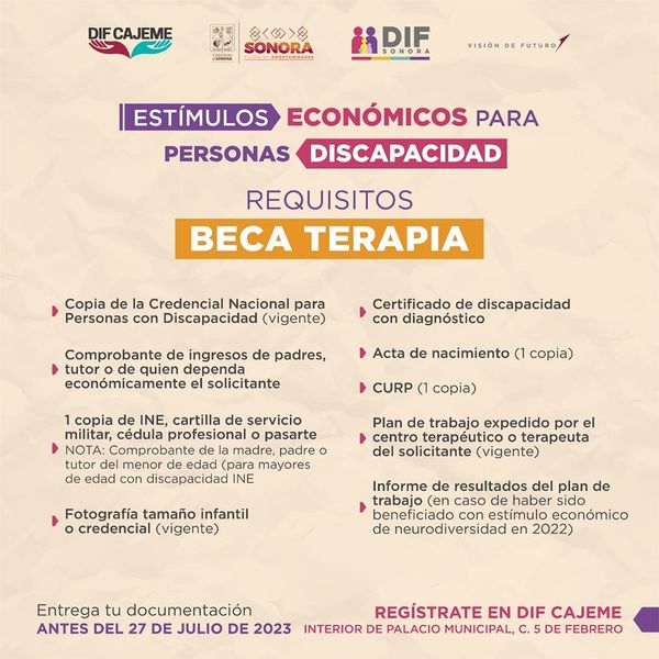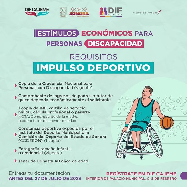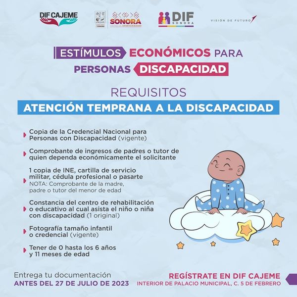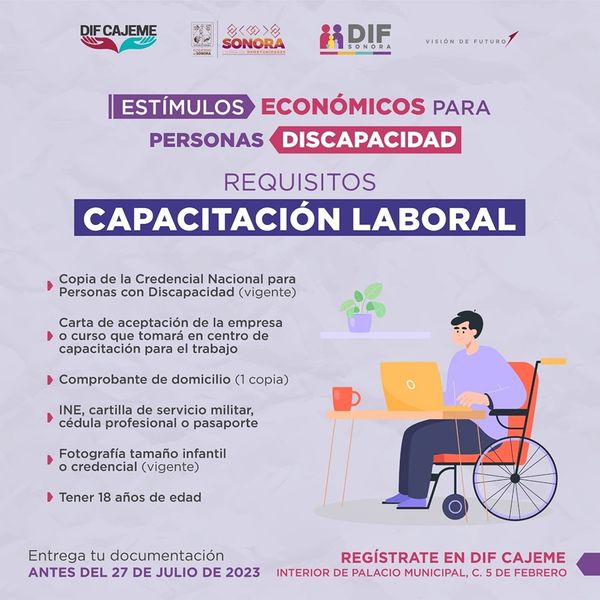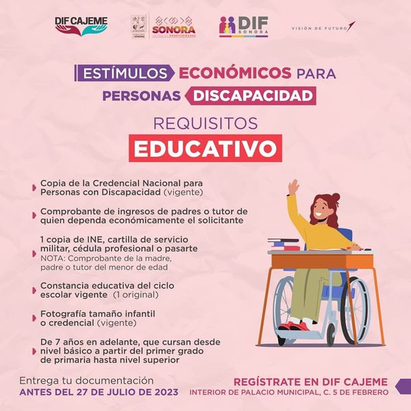 El Gobierno del Estado de Sonora, a través de DIF Sonora y en coordinación con DIF Cajeme, informan a la comunidad que inicia oficialmente el registro de los Estímulos Económicos para Personas con Discapacidad.