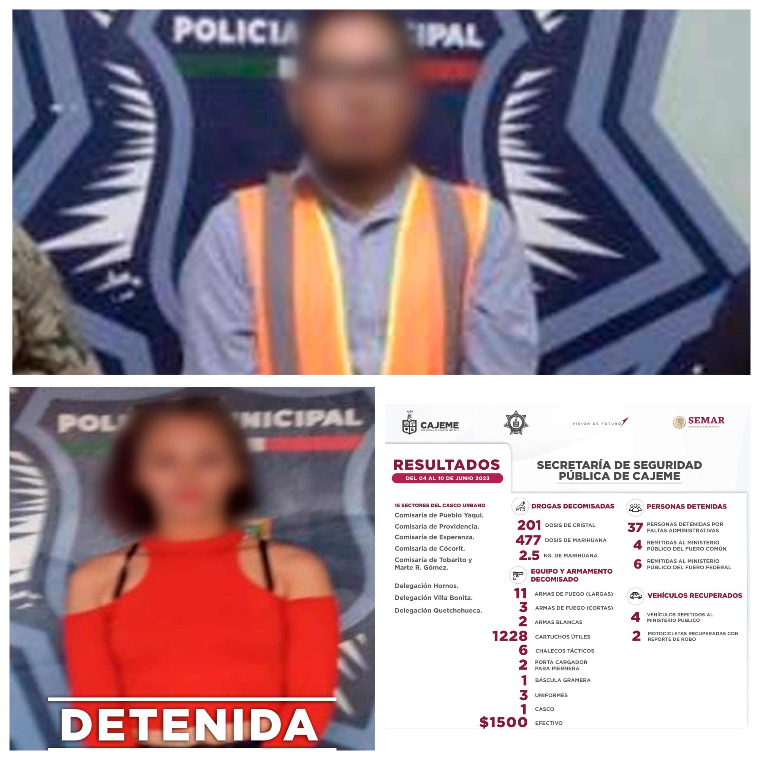Las acciones de la Secretaría de Seguridad Pública en Cajeme dieron como resultado un total de 47 personas detenidas por elementos de la Policía Municipal en coordinación con la Secretaría de Marina y las diversas corporaciones, de los cuales 37 fueron por faltas administrativas, 4 se turnaron al Ministerio Público del Fuero Común y 6 al Fuero Federal.